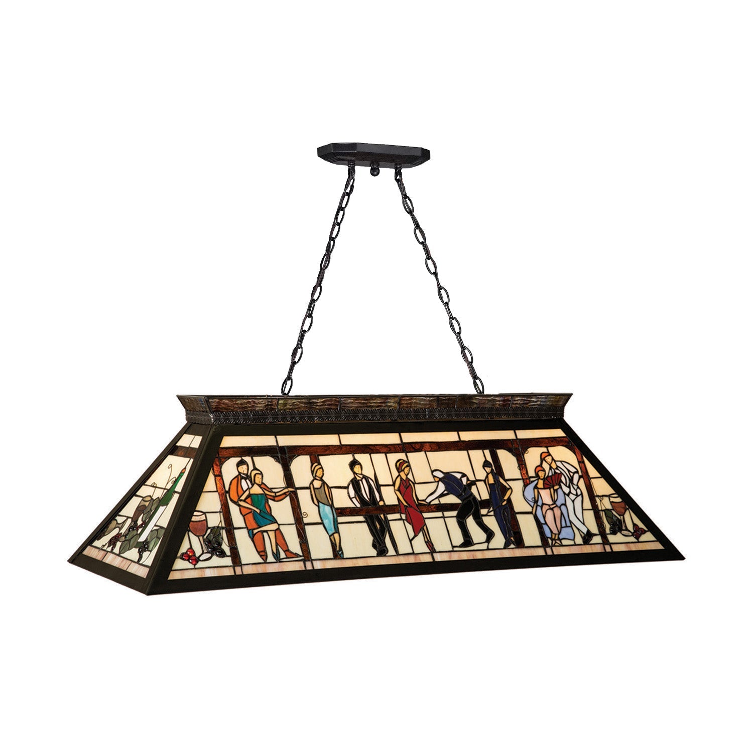 Featuring a metal frame in a dark finish, this 44-inch billiard pendant features a stained glass shade with depictions of drinks, dancing, and game play. This item is stocked in warehouse for prompt shipping and minimal process time (1–2 business days).Features