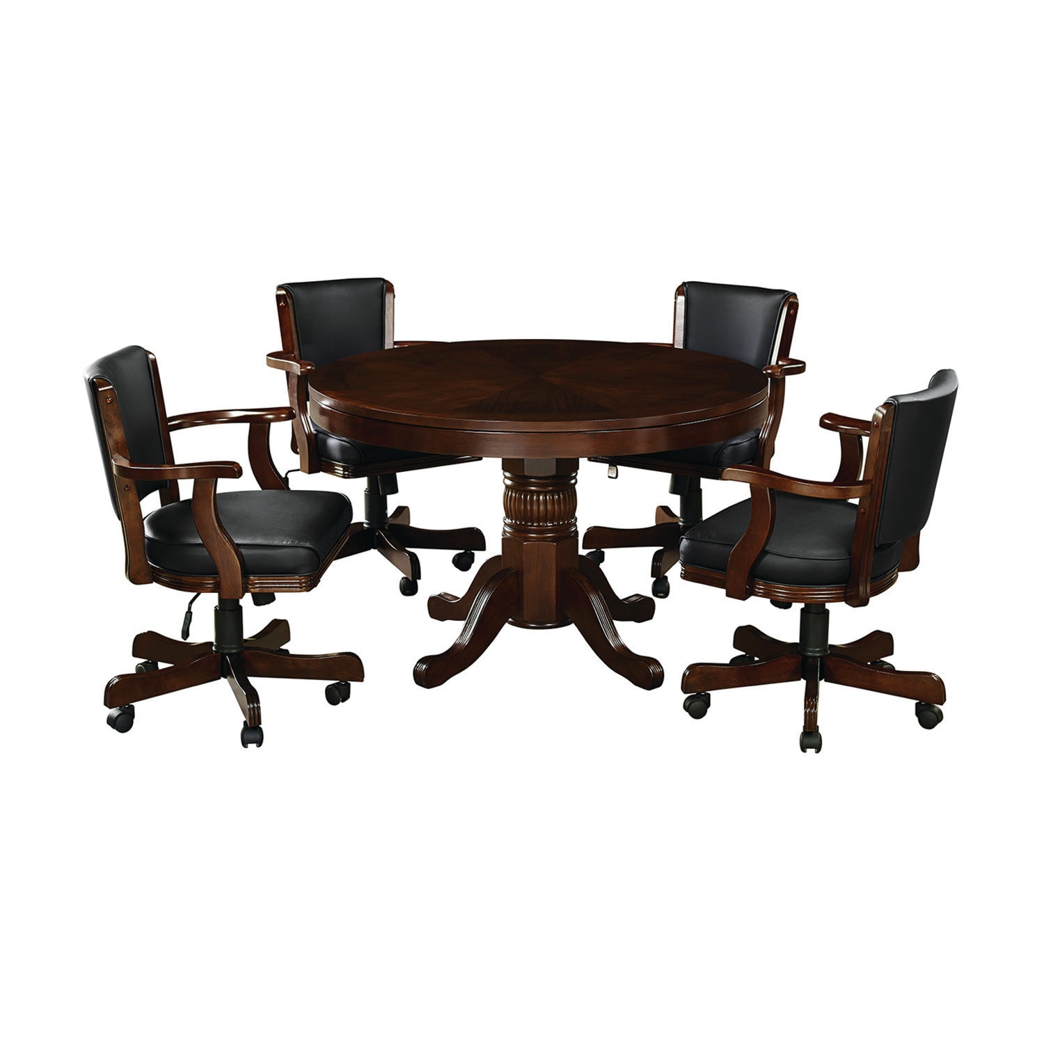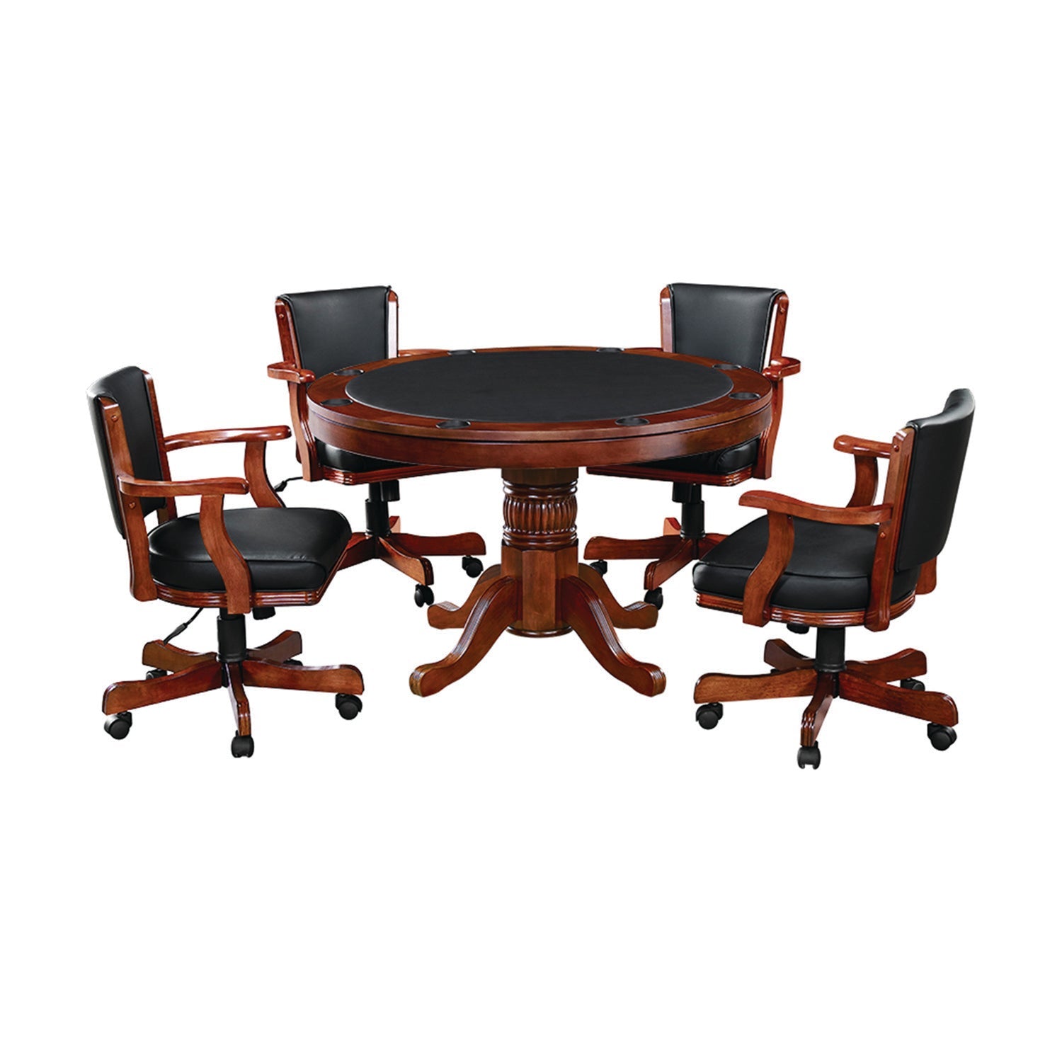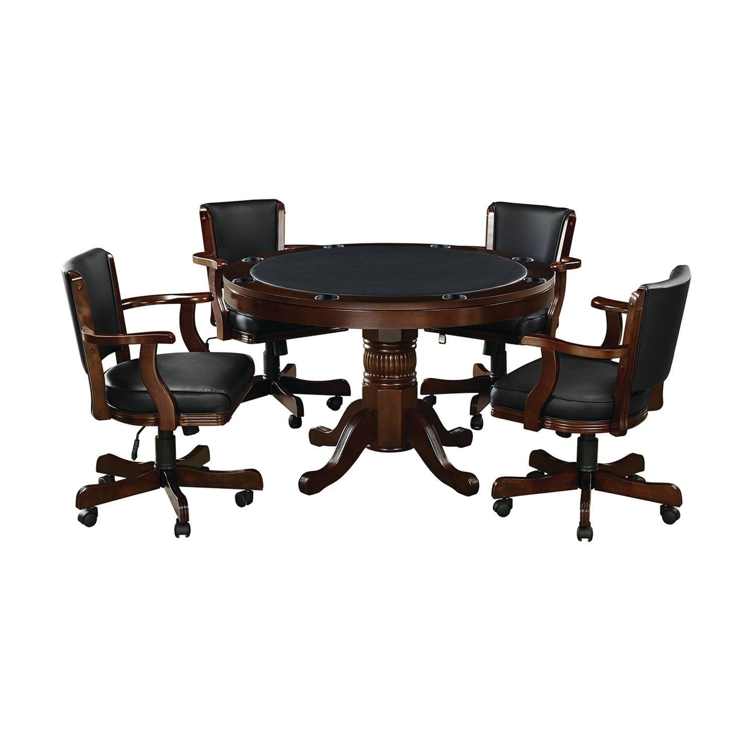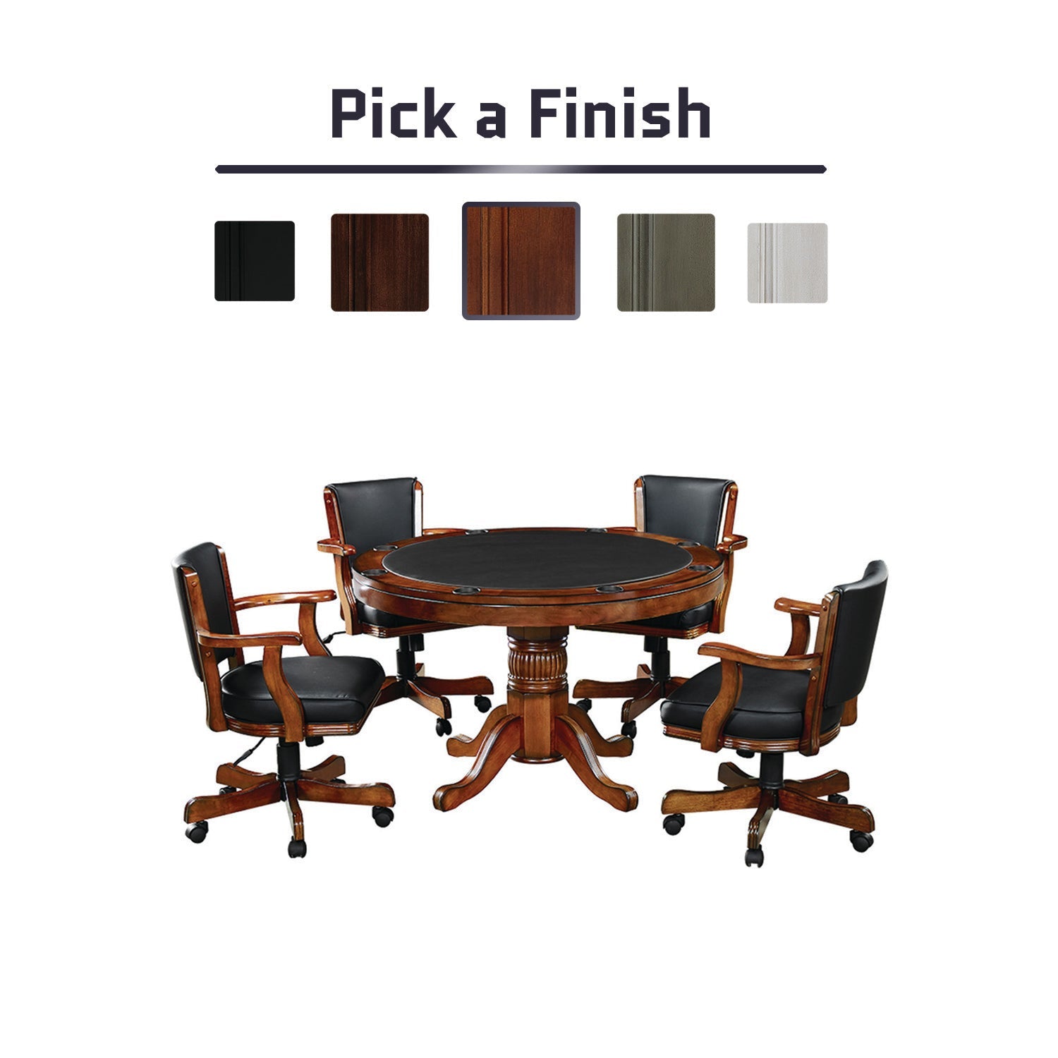 Perfect for everything from Blackjack to Texas Hold 'Em, this round card table boasts beautiful solid wood construction in either one of our 6 signature finishes, with a padded vinyl playing surface. 4 matching swivel game chairs are included in this set. This item is stocked in warehouse for prompt shipping and minimal process time (1–2 business days).Features