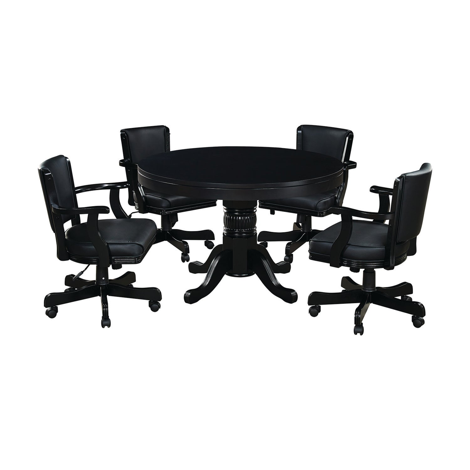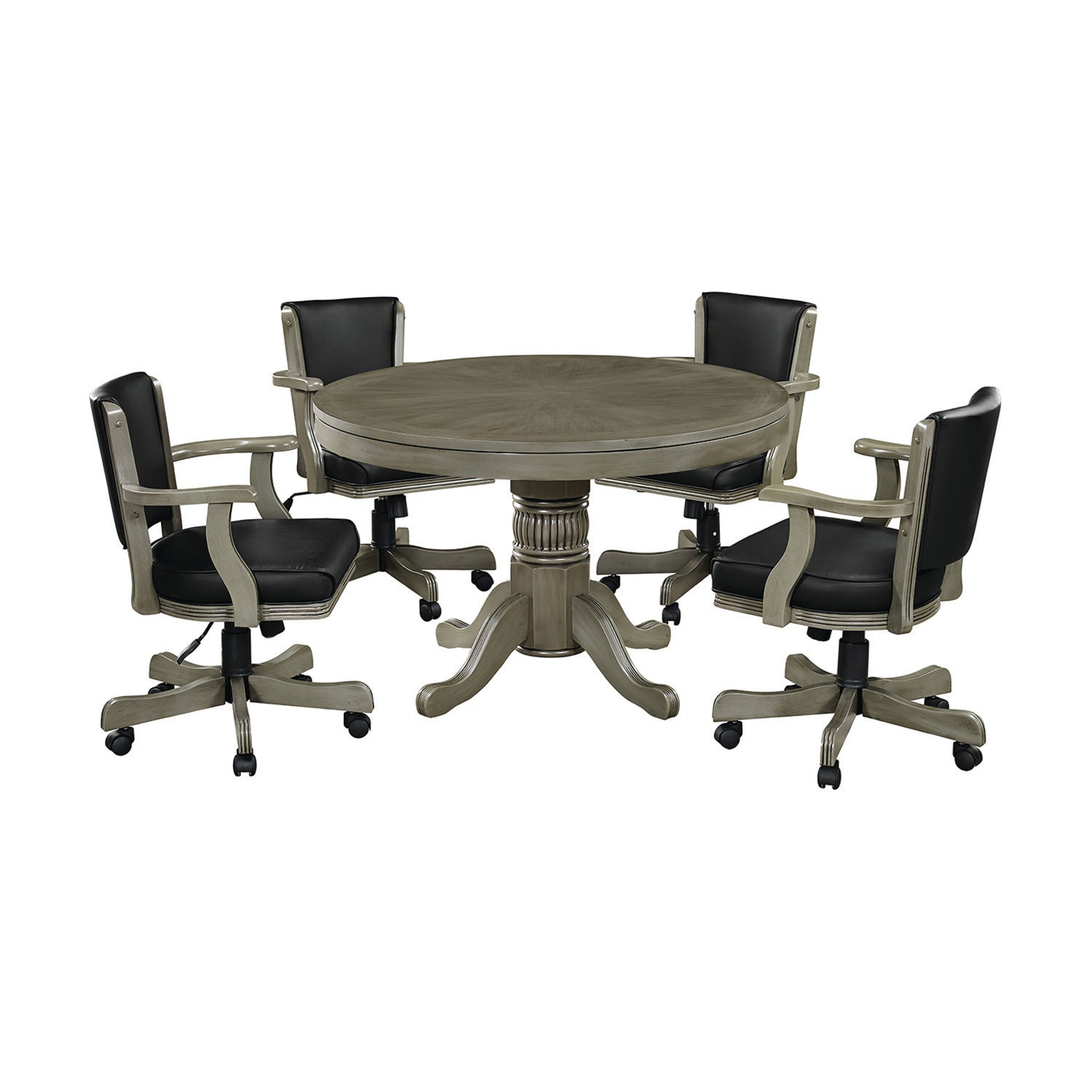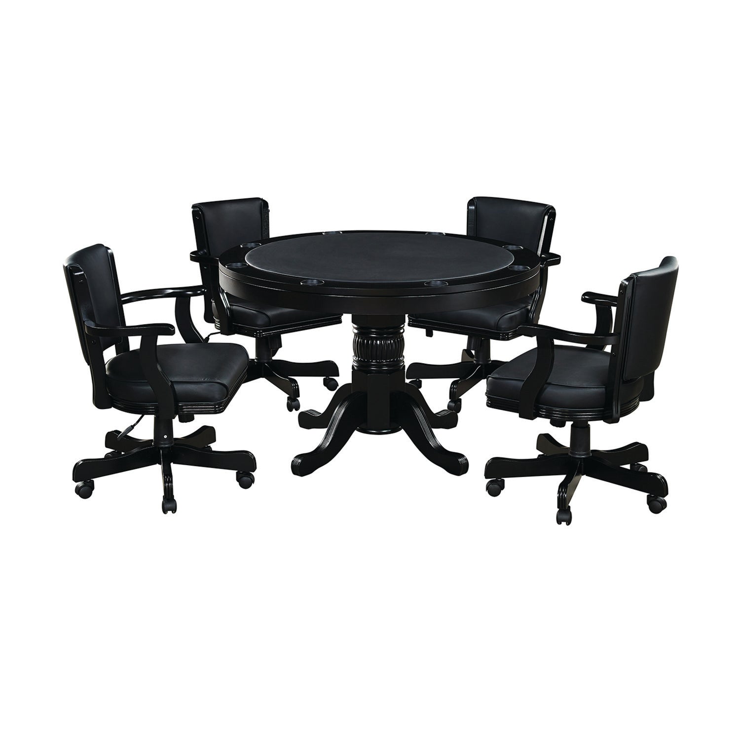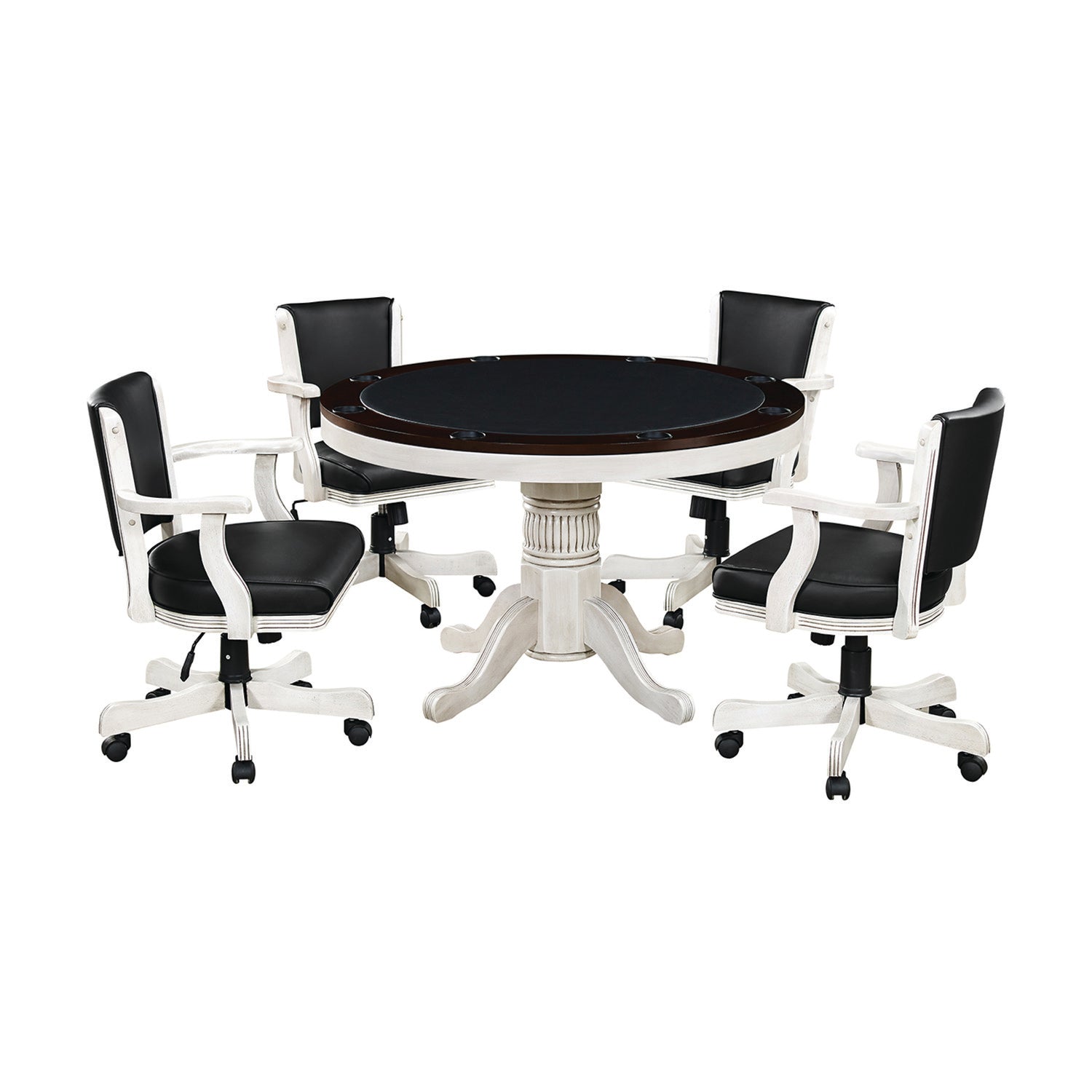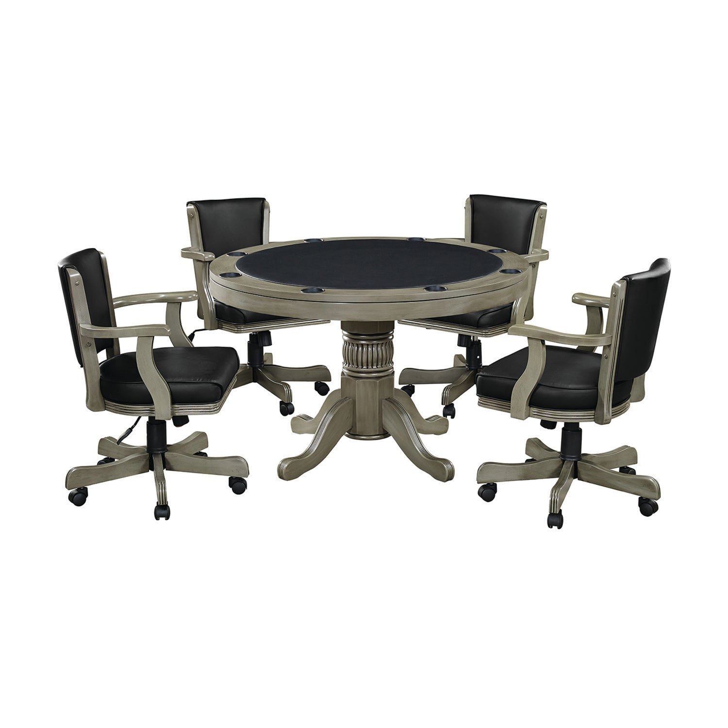 Perfect for everything from Blackjack to Texas Hold 'Em, this round card table boasts beautiful solid wood construction in either one of our 6 signature finishes, with a padded vinyl playing surface. 4 matching swivel game chairs are included in this set. This item is stocked in warehouse for prompt shipping and minimal process time (1–2 business days).Features