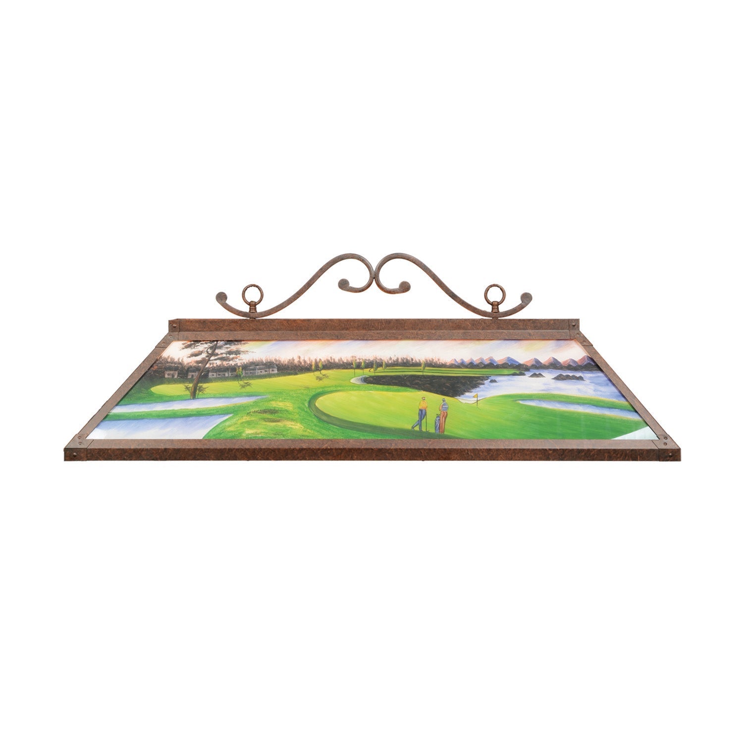 A classic golf course is brilliantly rendered on the reverse painted glass shade of this hand-painted billiard island pendant. This item is stocked in warehouse for prompt shipping and minimal process time (1–2 business days).Features