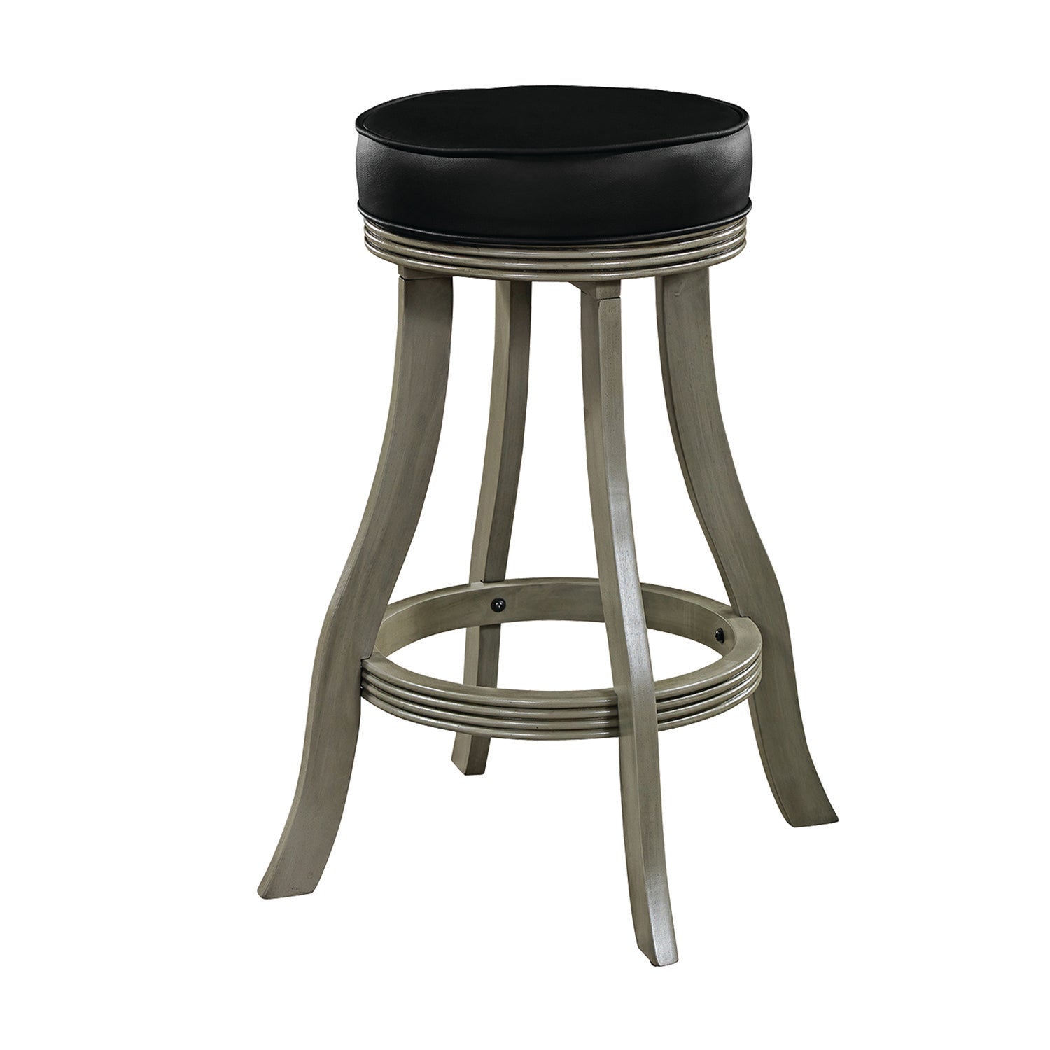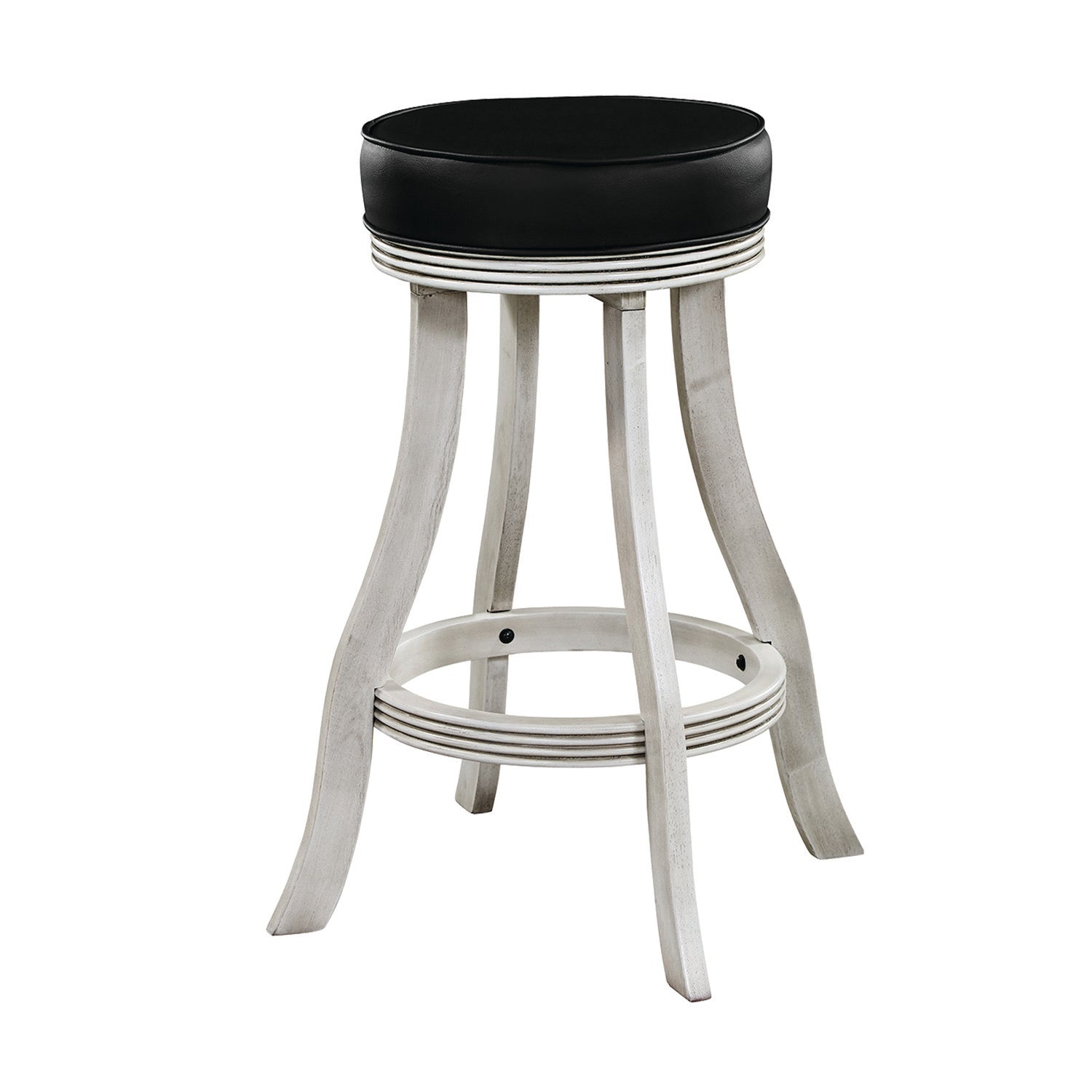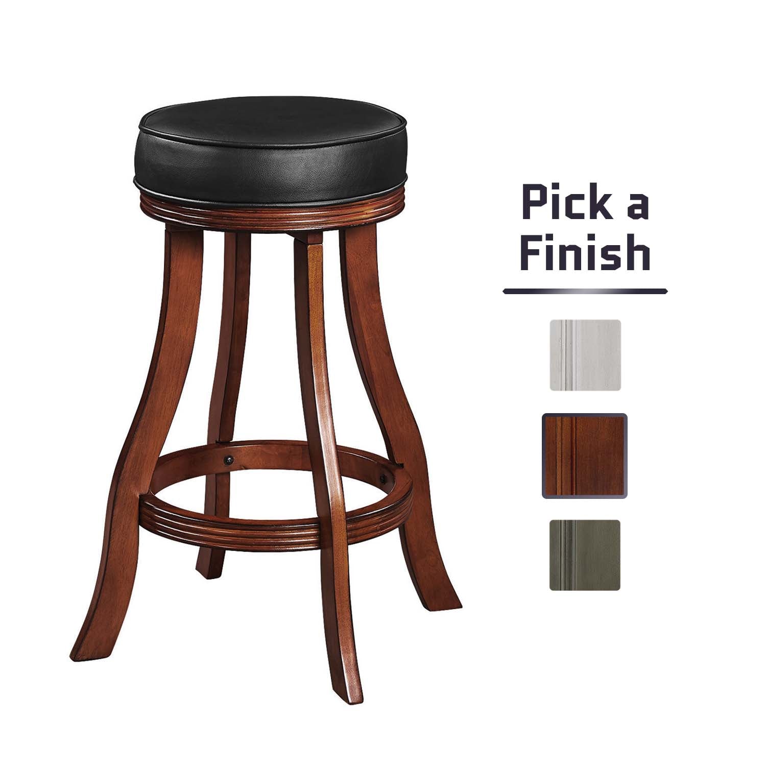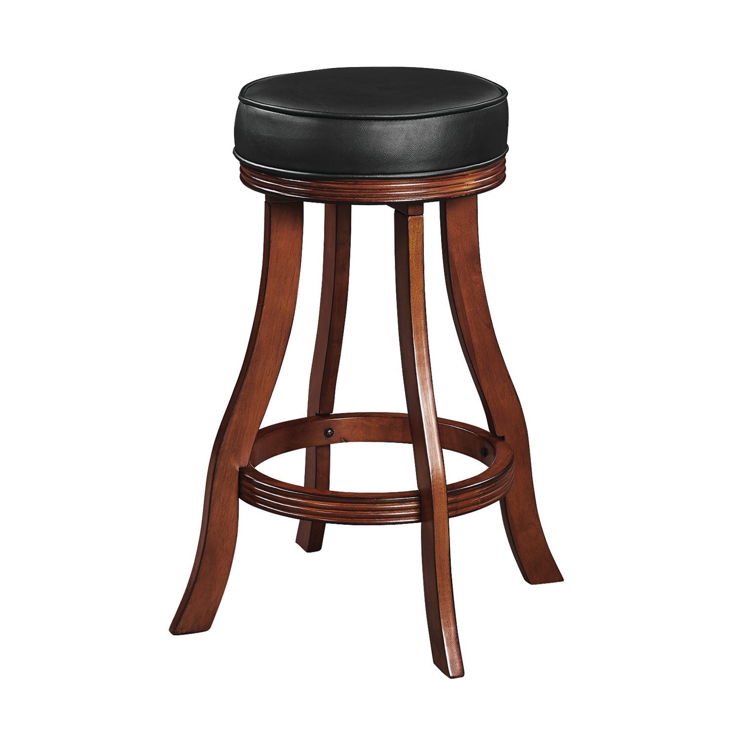 Simple and elegant, this backless barstool delivers exceptional seating to a pub table or gaming venue. A stylish look for the kitchen or entertainment room, this barstool features a round, padded vinyl seat with no back for versatility and traditional appeal. The base is crafted from solid wood with a premium finish, and features a footrest that circles all four legs. The legs features a slight curvature that adds dimension and visual appeal. Available in 6 material finishes! This item is stocked in warehouse for prompt shipping and minimal process time (1–2 business days).Features