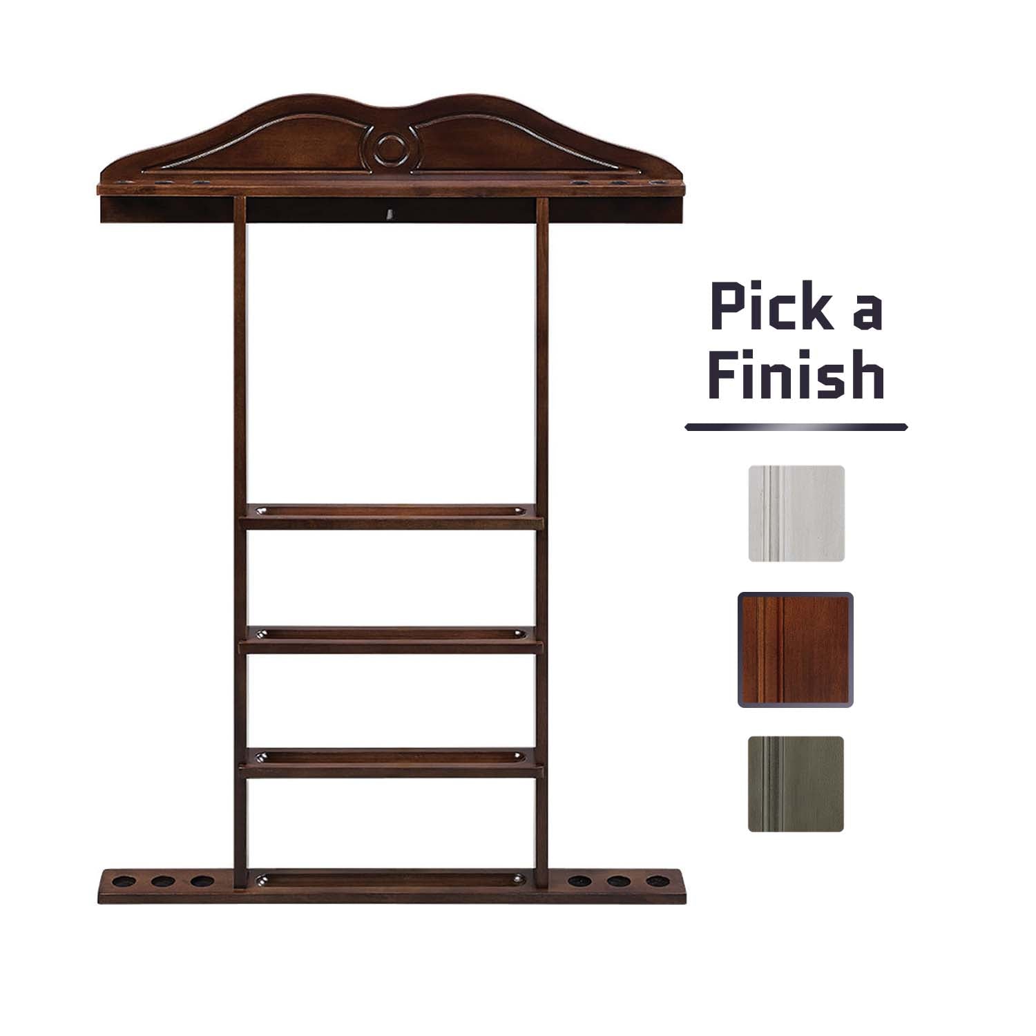 Designed for the wall of your stylish game room, this solid wood pool cue rack offers needed organization in one of our 6 signature wood finishes. This item is stocked in warehouse for prompt shipping and minimal process time (1–2 business days).Features